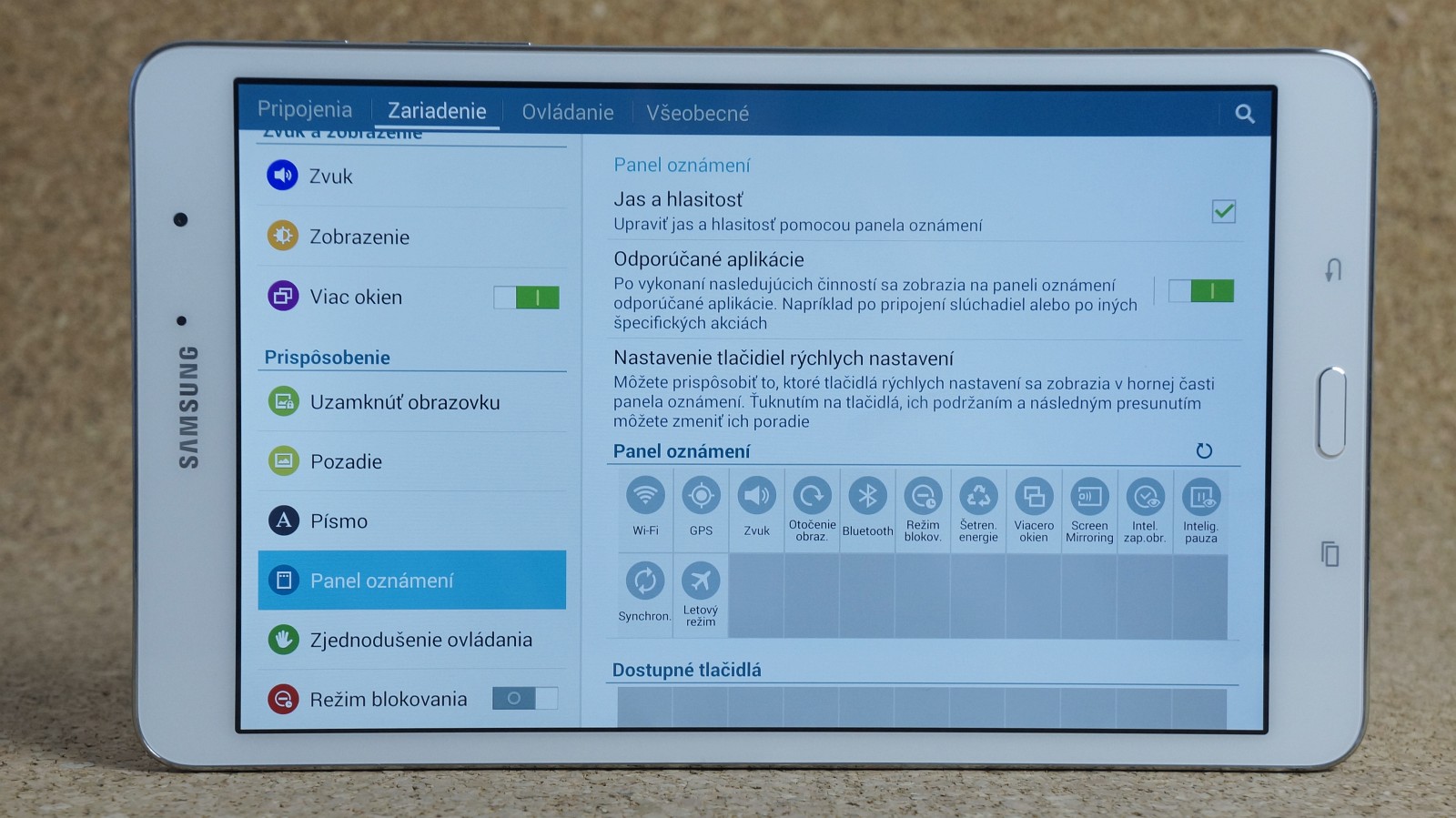 Vďaka slušnej hmotnosti mi držanie v jednej ruke nerobí žiaden problém. A to ani pri dlhšom sledovaní seriálov. Ťažšie srdce mám na dotykové tlačidlá pod displejom. Prekážali mi na modeli Note 10.1 2014 a prekážajú mi aj tu. Pri uchytení dvomi rukami som viackrát nechtiac stlačil jedno z dotykových tlačidiel. Stredné hardvérové tlačidlo určite vítam, no bez dotykových by bol svet krajší. Tlačidlo šípky späť ostalo, kontextové tlačidlo nahradilo tlačidlo spustených aplikácií. Jeho dlhším podržaním sa zobrazí kontextová ponuka v jednotlivých aplikáciách. Dlhšie podržanie stredného hardvérového tlačidla spustí službu Google Now, dvojitým stlačením sa dostanete do asistentky S Voice. Slovenčina stále chýba.