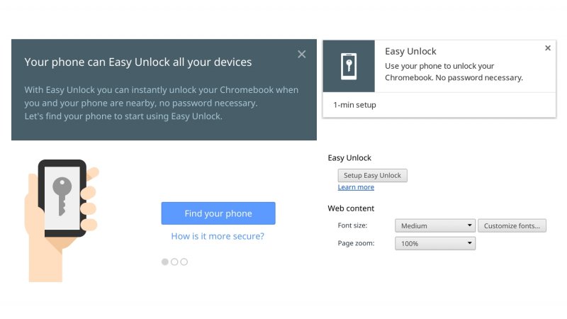 Google vo svojom operačnom systéme Chrome OS (rozširovanom najmä spolu s lacnými notebookmi) pripravuje funkciu "Easy Unlock". Momentálne ju možno povoliť v nastaveniach pre vývojárov, hoci zatiaľ nefunguje korektne. Kliknutie na tlačidlo "Find your phone" by malo spustiť hľadanie (pravdepodobne prostredníctvom Wi-Fi alebo Bluetooth) a v prípade, že sa v blízkosti nachádza telefón oprávneného používateľa danej kópie operačného systému, Chrome OS preskočí okno s požiadavkou pre vloženie prístupového hesla a zobrazí priamo pracovnú plochu.
