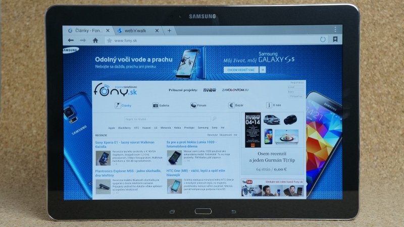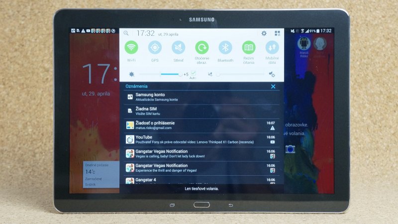 Tablet držím v oboch rukách, teda na rozmiestnení prvkov si až tak nepotrpím. Jednou rukou ho pridržím a druhou obslúžim potrebné tlačidlo. Dalo sa to však vyriešiť aj bez prehmatávania. Tlačidlá napájania a ovládania hlasitosti by som radšej videl v pravej alebo ľavej stene, kde by som ich pohodlne nahmatal pomocou ukazováka. Trochu netradičným riešením je umiestnenie microUSB konektora do pravej steny. Dolná tak ostala zbytočne prázdna. Samsung opäť osadil microUSB konektor vo verzii 3.0, ktorý ponúkne rýchlejšie dátové prenosy medzi tabletom a počítačom. Tablet však nabijete aj pomocou klasickej microUSB nabíjačky. Nechýba podpora OTG, ktorá umožní k tabletu pripojiť myš, klávesnicu, prípadne USB kľúč. S externým harddiskom si žiaľ neporadí.