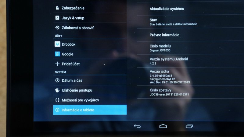 To je ale chyba Androidu ako takého, nie Gigasetu QV1030. Tomu v oblasti rýchlosti odozvy, výkonu či veľkosti pamätí nemožno nič vytknúť. Štvorjadrový Cortex-A15 s taktom 1,8 GHz či dvojgigabajtová RAM-ka stačia na všetko. Z deklarovaného 16 GB úložiska je síce pre používateľa dostupných len desať a ďalších 316 MB si ukroja systémové aplikácie, no v zálohe bude stále čakať slot na microSD kartu.