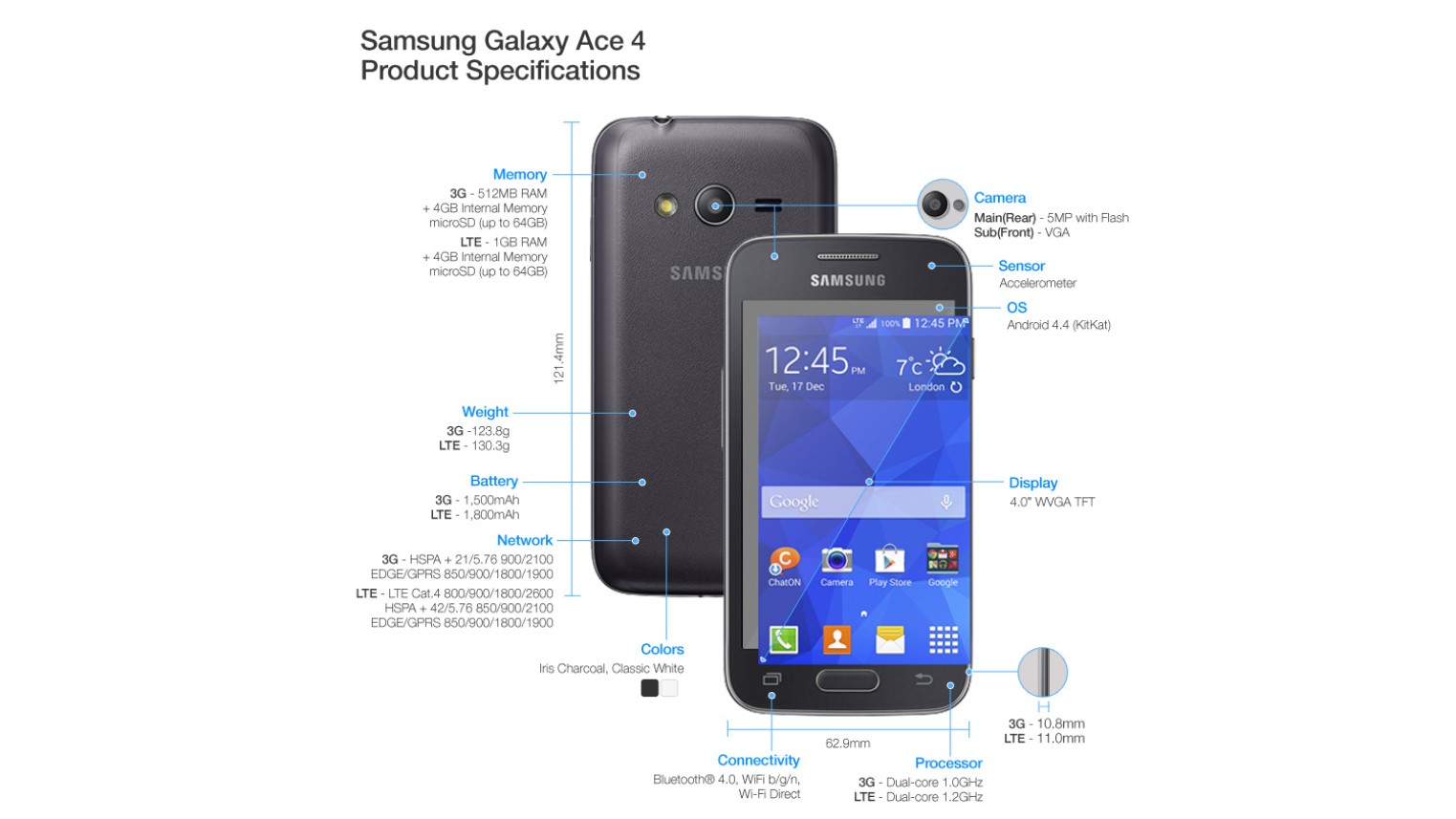 Samsung Galaxy Ace 4 je už, ako názov napovedá, štvrtou generáciou roky úspešného modelu. Prináša 4-palcový displej s WVGA rozlíšením 480 x 800 bodov, 512 MB alebo 1 GB (LTE verzia) RAM, 4 GB vnútorný priestor, dvojjadrový procesor a prednú VGA a 5 Mpix zadnú kameru. Tej nechýba prisvetľovacia dióda. Batéria bude v dvoch rôznych kapacitách, 3G verzia dostane 1 500 mAh akumulátor, LTE o 300 mAh silnejší.