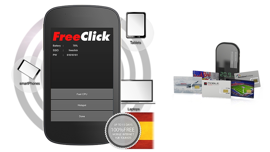 Úplne inak na to idú v Španielsku. Pre turistov (teda ľudí žijúcich mimo krajiny) je teraz dostupná služba FreeClick, ktorá by mala poskytovať rýchly internet (do 21 Mbps) pre smartfón, notebook alebo tablet na 15 dní úplne zadarmo. Projekt je financovaný vďaka miestnej vláde a sponzorom.