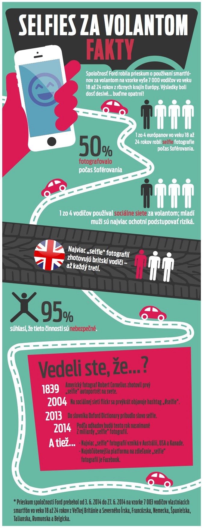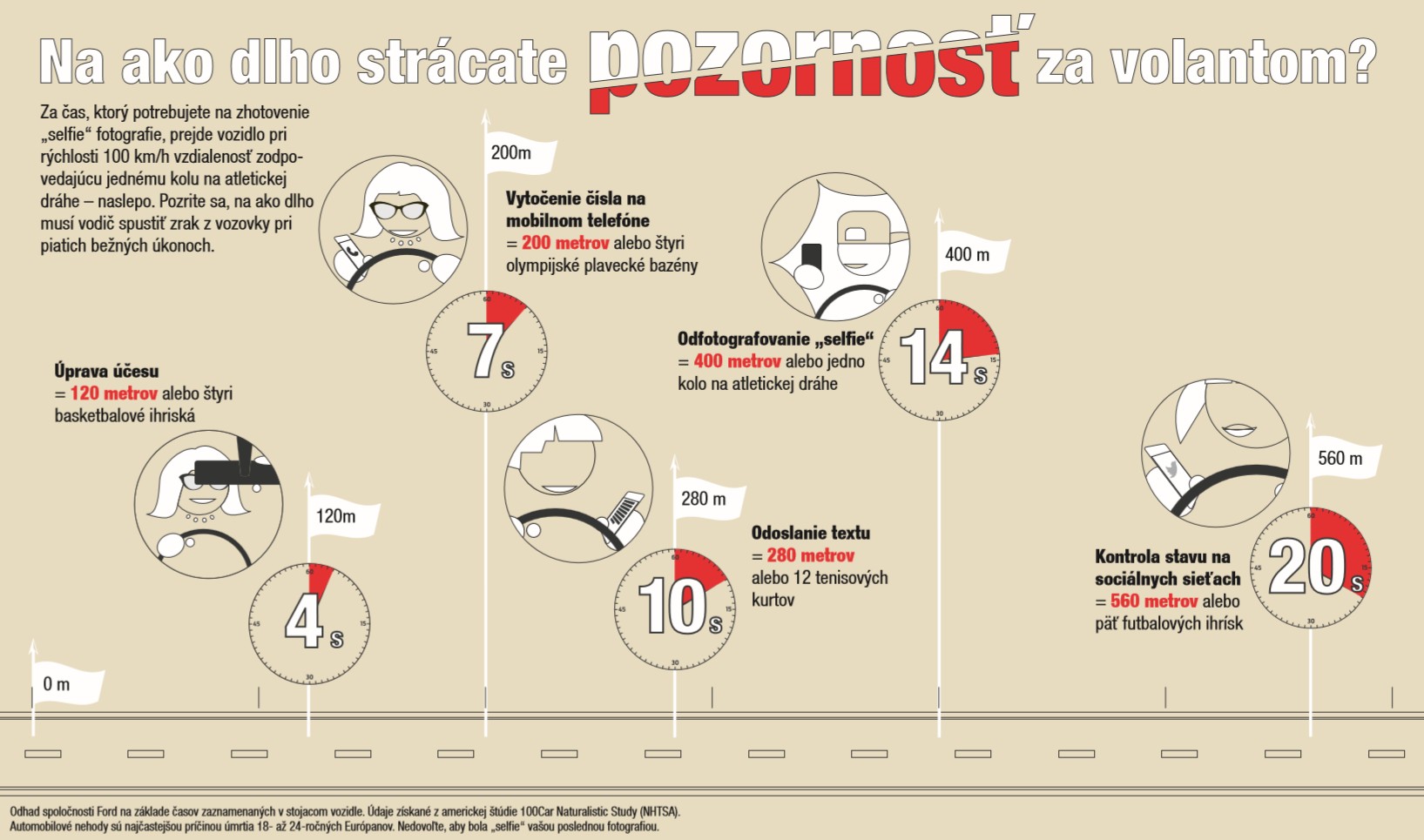 Odborníci spoločnosti Ford zistili, že fotografovanie selfie za volantom môže odviesť pozornosť vodiča na 14 sekúnd a kontrolovanie stavu na sociálnych sieťach až na 20 sekúnd – to je čas, za ktorý vozidlo idúce rýchlosťou 100 km/h prejde vzdialenosť zodpovedajúcu dĺžke piatich futbalových ihrísk.