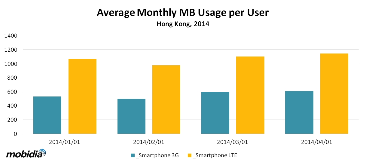 Priemerná spotreba dát za mesiac v Hong Kongu - 3G a LTE siete. (obr: Mobidia)