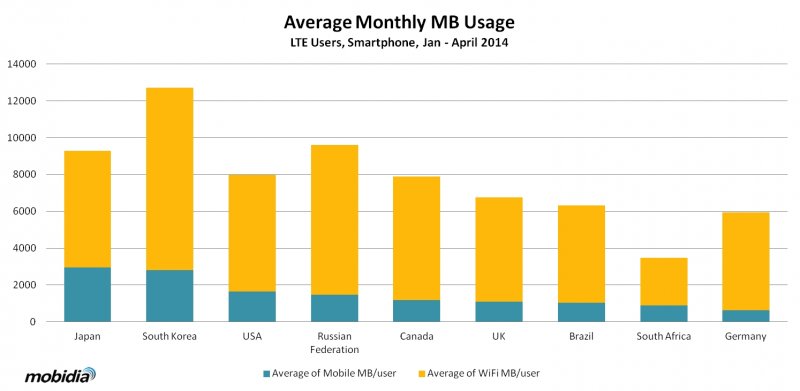 Priemerná spotreba dát za mesiac - LTE a Wi-Fi siete. (obr: Mobidia)