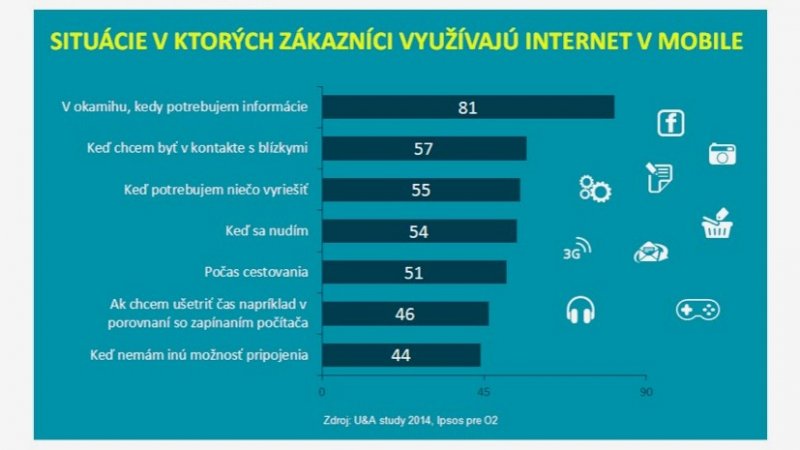 Až v troch štvrtinách prípadov využívajú zákazníci vo svojom mobile internet na vyhľadávanie (74 %), e-mail (74 %) a sociálne siete (73 %). Takmer polovica používateľov internetu v mobile (47 %) využíva aj službu počasia. Používatelia si tiež radi prezrú spravodajské portály (43 %) a mapy či navigáciu (42 %).