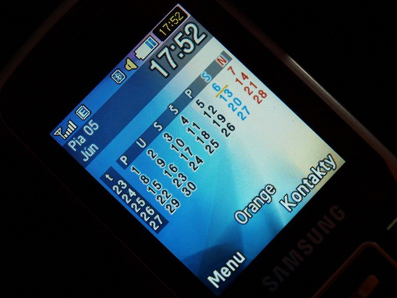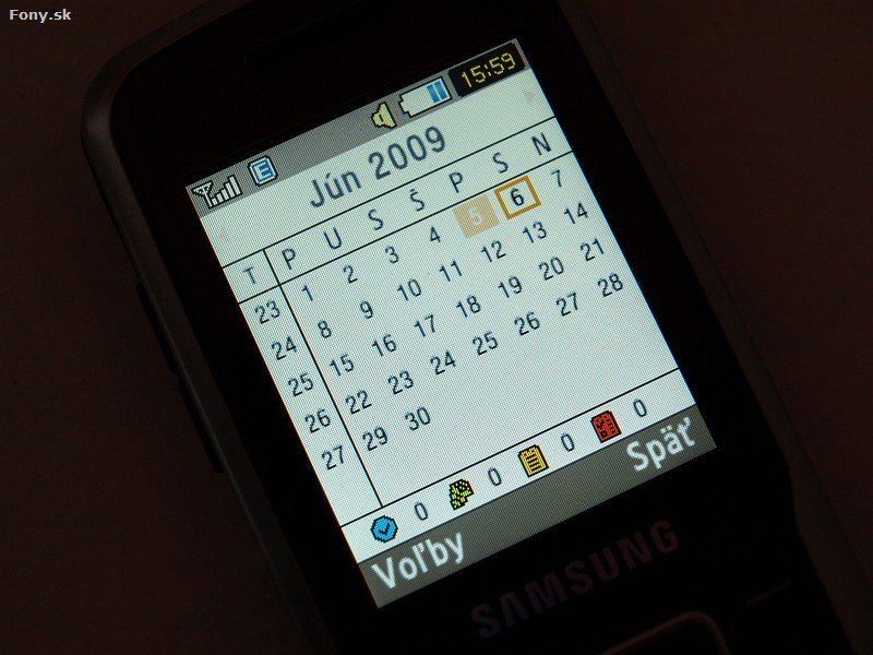 zobrazuje dni v mesačnom náhľade a môže byť zobrazený aj na domácej obrazovke. Za zmienku stojí už len jeho obmedzená kapacita na 400 záznamov.Samsung S3110 ponúka aj ďalšie organizačné funkcie ako: poznámky, svetový čas,
