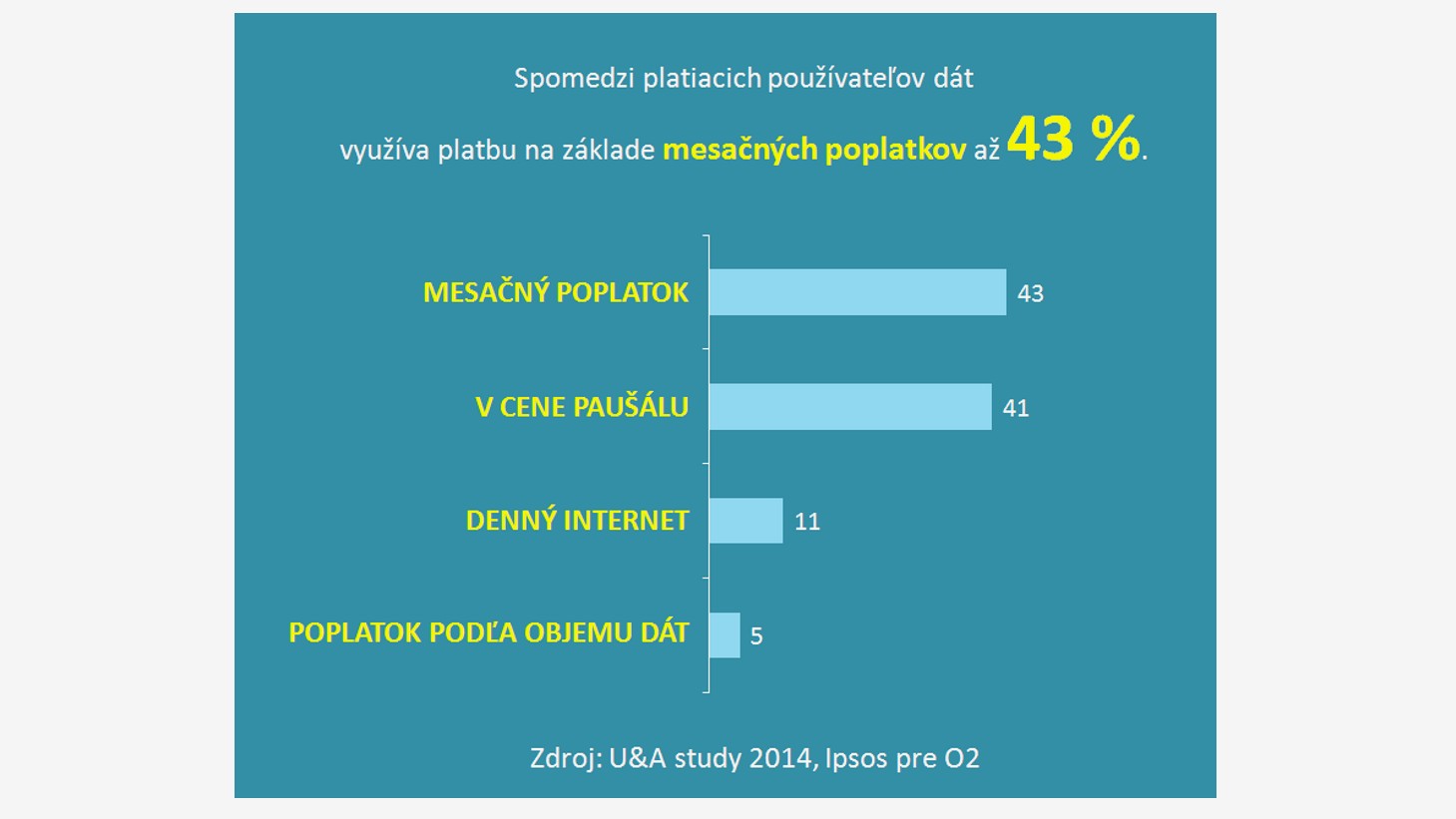 Spomedzi platiacich používateľov dát využíva platbu na základe mesačných poplatkov až 43 %. O niečo menej (41 %) využíva dáta, ktoré má k dispozícii v rámci svojho paušálu. Platby na dennej báze (tzv. denný internet) využije približne 11 %. Iba 5 % platiacich zákazníkov uviedlo, že využíva systém platby len za to, čo spotrebuje.