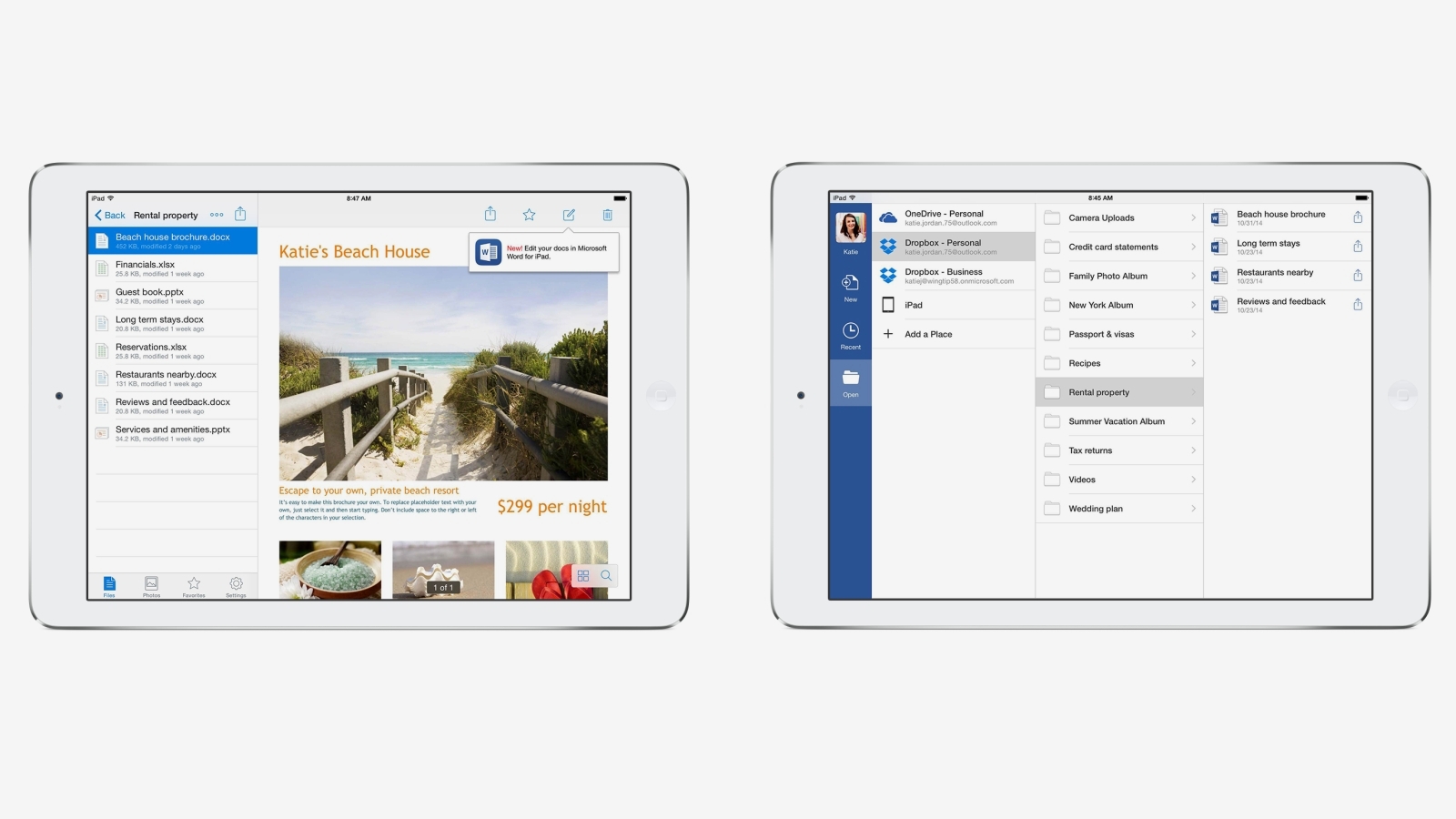 Už čoskoro bude možné pristupovať k súborom na Dropboxe priamo cez mobilnú aplikáciu Office na Androide i iOS. Obe aplikácie navyše už nebudú vyžadovať predplatné služby Office 365. Pribudne aj opačná možnosť, teda editácia vašich Office dokumentov priamo cez adresu Dropbox.com. Používateľovi sa v jeho webovom prehliadači po kliknutí na konkrétny súbor otvorí rozhranie Office Online.