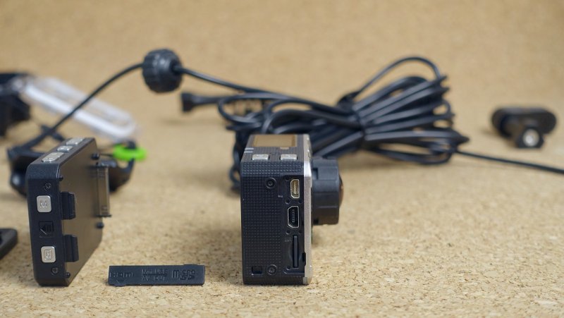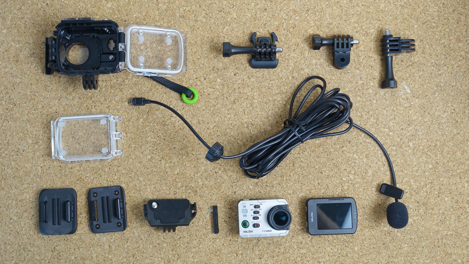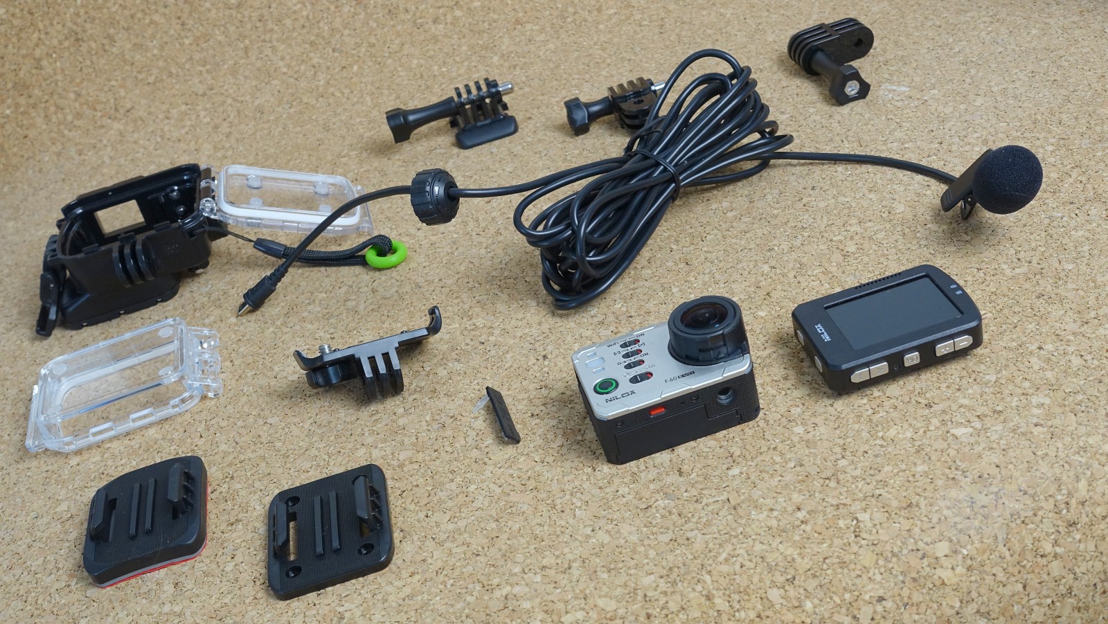 V balení Nilox F60 EVO nájdete kameru, pripojiteľný modul s displejom a tlačidlami na zmenu nastavení, vodotesné puzdro s vymeniteľnými dvierkami (pre kameru s pripojeným displejom aj bez neho), koľajničky pre upevnenie pomocou 3M pásky aj dvoje koľajničky na priskrutkovanie k rôznym predmetom. Prekvapil ma mikrofón na dlhom kábli, ktorý môžete pripojiť ku kamere aj vo vodotesnom puzdre! Vtedy sa vodotesnosť trochu zníži, a to z IP68 na IP66.