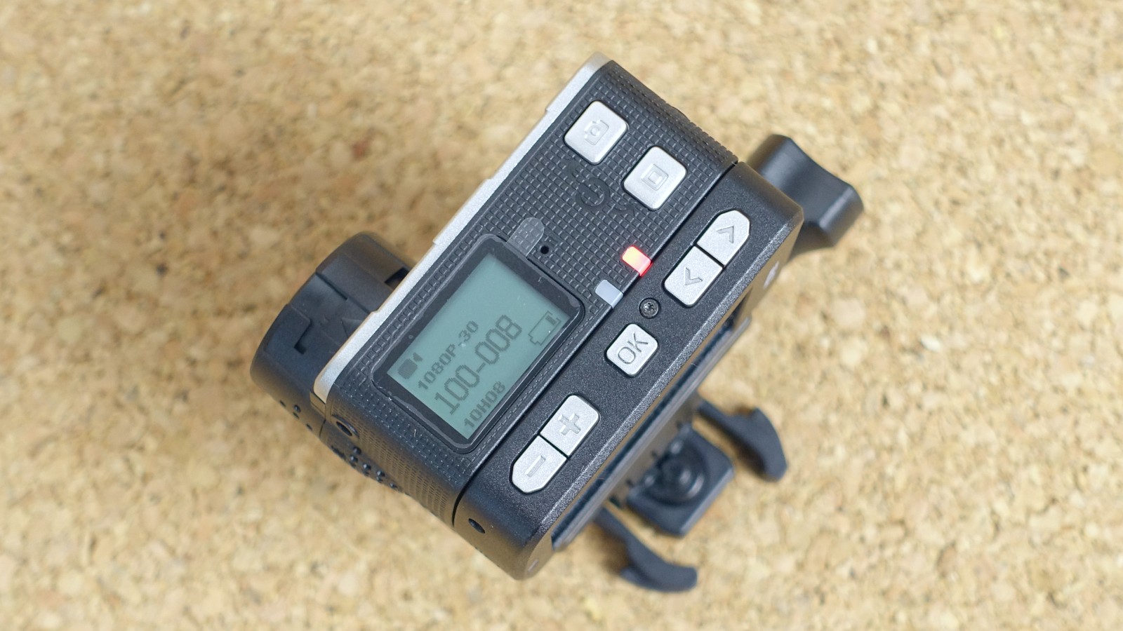 Nechýbajú ani tlačidlá na záznam videa a snímanie fotografií. Vypnutie záznamu uskutočňujete iným tlačidlom než zapnutie. Je to spočiatku dosť neprirodzené a doteraz som neprišiel na výhodu tohto riešenia. Monochromatický displej v hornej stene vás informuje o voľnom priestore na vloženej microSD karte, stave batérie, nabíjaní, atď.