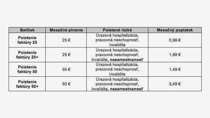 So službou Poistenie faktúry 50 získa zákazník v prípade vzniku poistnej udalosti poistné krytie 50 eur mesačne (až do výšky 300 eur) za 1,49 € mesačne. V rámci služby Poistenie faktúry 50+ za mesačný poplatok 3,49 eur, ktoré zahŕňa aj riziko nezamestnanosti, získa poistné krytie až do výšky 1 800 eur.
