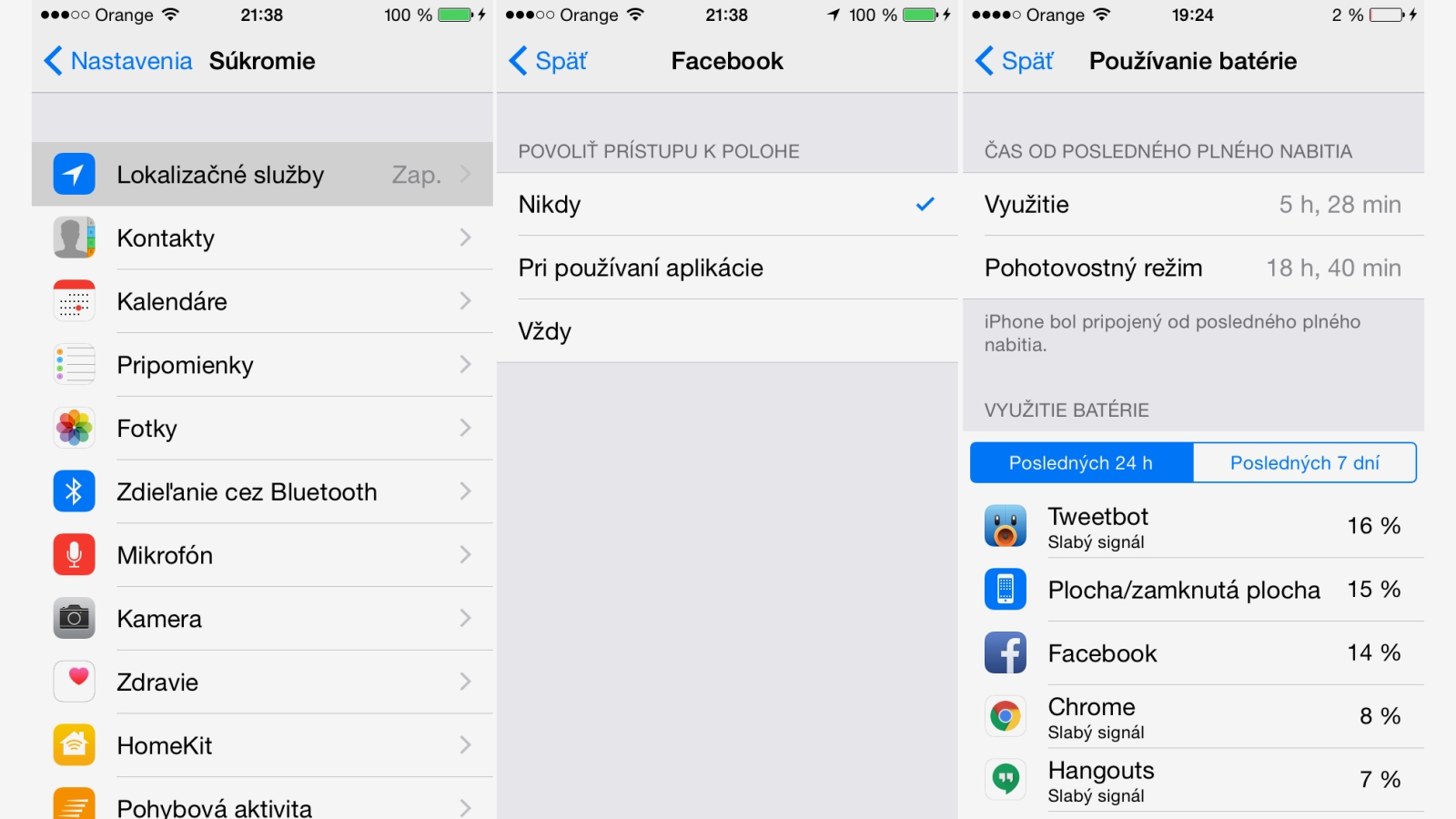 Vyskúšal som teda aj spomínaný zákaz prístupu k lokalizačným službám (Nastavenia -> Súkromie -> Lokalizačné služby -> Facebook) a spotrebu svojho iPhonu potom pozorne sledoval počas celého týždňa.
