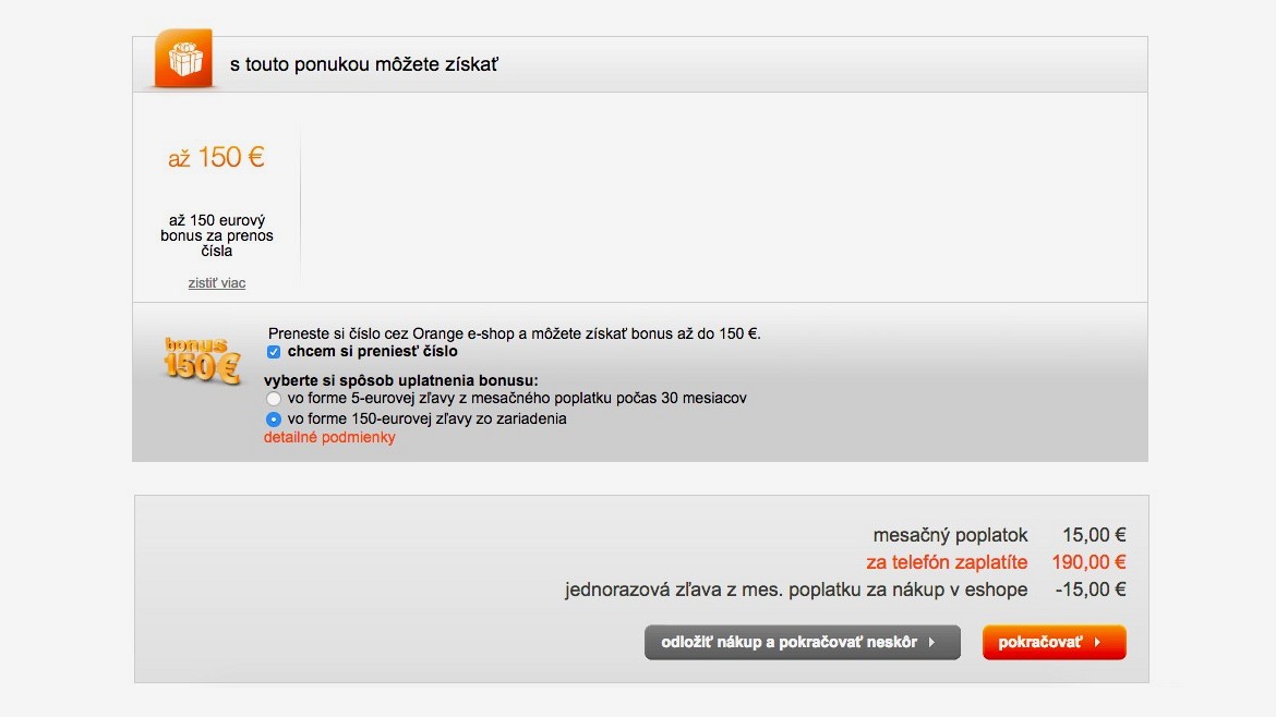 Zákazník sa pri prenose čísla cez e-shop operátora môže rozhodnúť, či chce mať po dobu 30-tich mesiacov päťeurovú zľavu z faktúry alebo si jednorazovo uplatní zľavu z akciovej ceny telefónu. Podmienkou je opäť 24-mesačná viazanosť.
