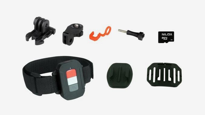 kamera, 1000 mAh batéria, 8 GB microSD, diaľkové infračervené ovládanie, kábel microUSB - USB, puzdro odolné do hĺbky 55 m, 2 x nálepka 3M, 1 x redukcia do plochého a zahnutého držiaka (oba tiež v balení).
