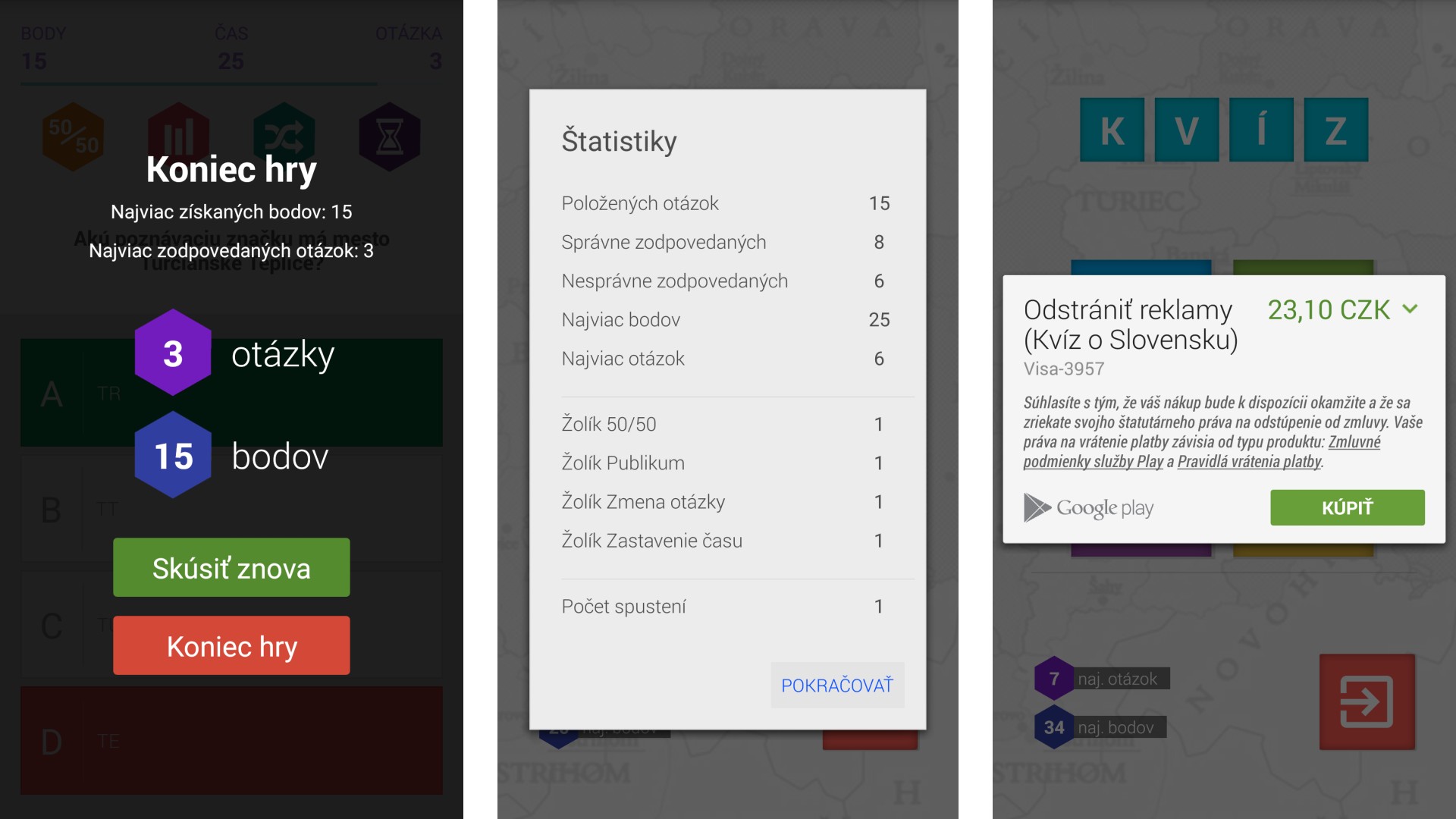 Otázky sú z kategórií príslovia, porekadlá, história, geografia, sviatky, hudba, hudobné skupiny, filmy, politika, spoločnosti a firmy, šport, ŠPZ-ky, slovenský jazyk, spisovatelia a ich diela a podobne. Po nesprávnej odpovedi končí kolo a vy sa rozhodnete, či hru ukončíte alebo začnete odznova. Svoje výsledky si môžete pozrieť v prehľadnej štatistike.