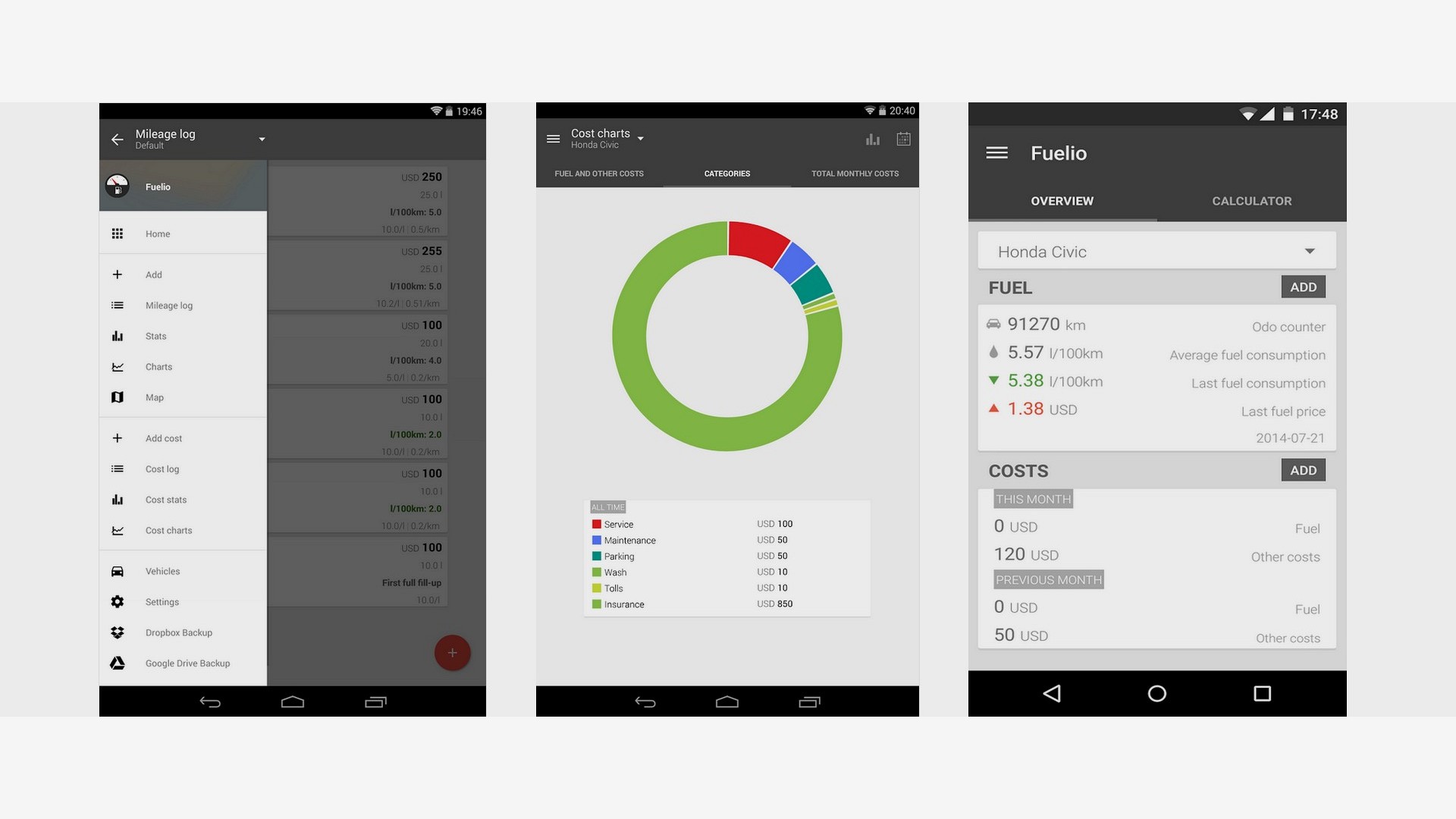 S Fuelio: palivo a náklady môžete sledovať výdavky za benzín a ďalšie položky, ktoré sú usporiadané do prispôsobiteľných kategórií, ako napríklad služby, údržba, poistenie, autoumyváreň, parkovanie a podobne.