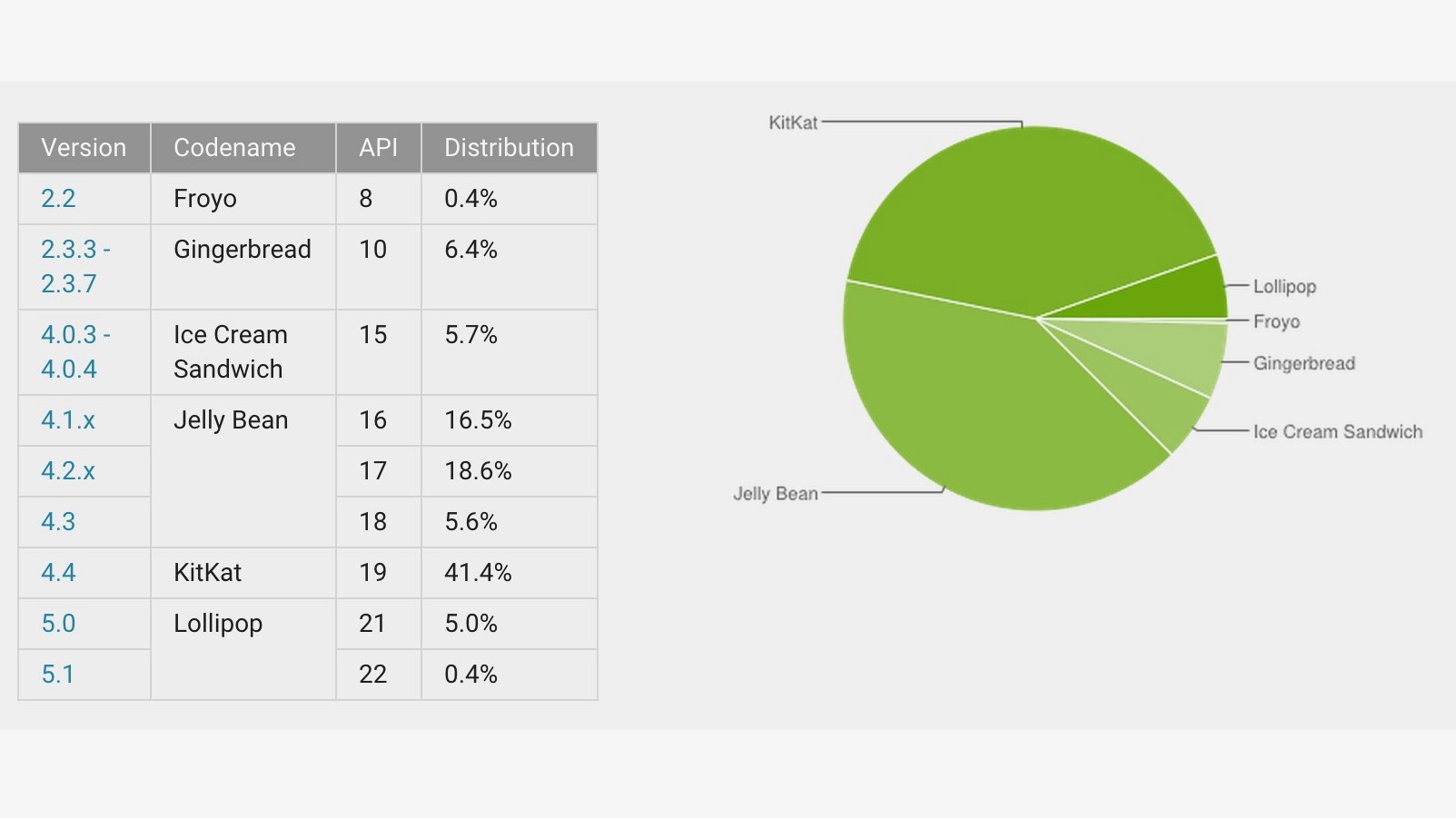 Aktuálne výsledky vychádzajú zo zhromaždených údajov počas 7-dňového obdobia, ktoré sa skončilo 6. apríla 2015. Údaje sú určené hlavne vývojárom aplikácií pre lepšiu orientáciu, koľko majiteľov androidov akú platformu používa. Dáta sú získavané z obchodu s aplikáciami Google Play.