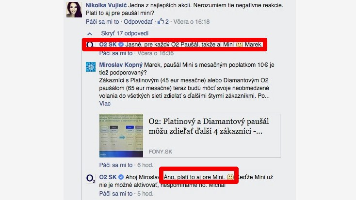 Z textu medzi zákazníkom O2 a administrátorom na facebookovej stránke O2 SK však vyplýva, že akcia sa vzťahuje aj na tých, ktorí stále využívajú najnižší paušál O2 Mini, hoci ten už nie je v ponuke a nedá sa aktivovať. No keď ho máte, neobmedzené volania vám, môže darovať ktokoľvek s Platinovým alebo Diamantovým paušálom. Dôvodom, prečo túto možnosť operátor nepomenul v tlačovej správe ani na tlačovej konferencii je podľa vyjadrenia na Facebooku to, že O2 Mini sa už nedá aktivovať a využíva ho len malé množstvo zákazníkov.