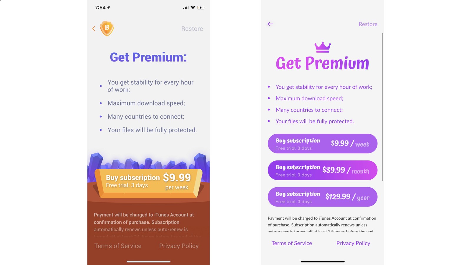 Aplikácie, ktoré sa vydávajú za poskytovateľa VPN pripojenia, účtujú používateľom po uplynutí skúšobnej doby 9,99 dolárov týždenne. Na prvý pohľad vyzerajú neškodne. Každá má veľmi slušné hodnotenie v rozmedzí 4,6 až 4,8 hviezdičiek a nechýbajú nadšené recenzie s opakujúcimi sa výrazmi ako "Exciting" alebo "My love".