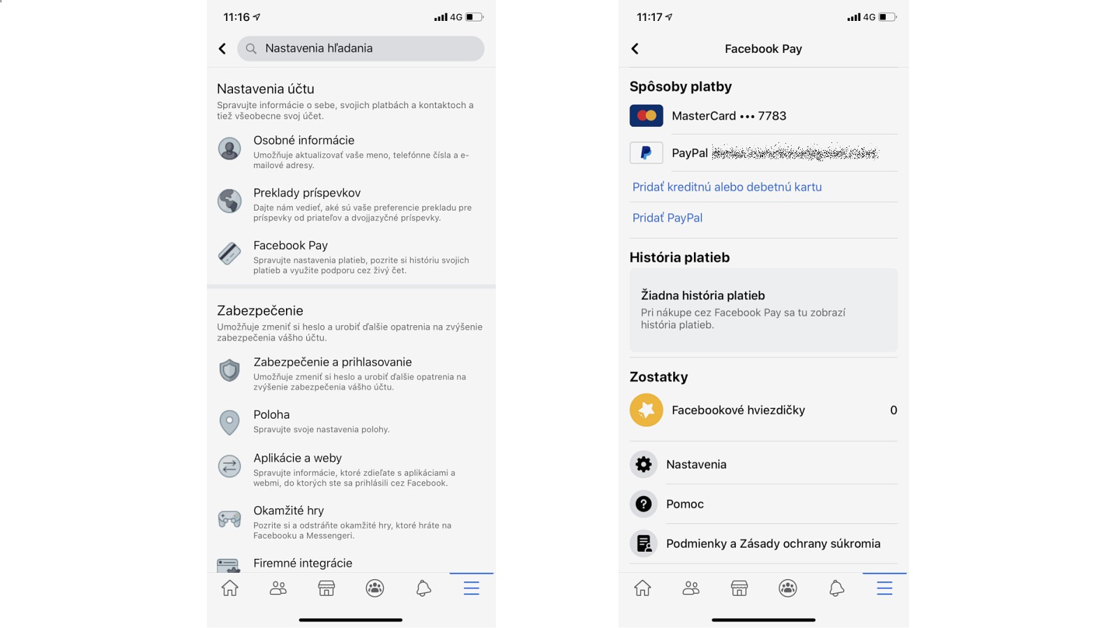 Čitateľ František si nedávno všimol, že v nastaveniach Facebooku pribudla sekcia Facebook Pay, do ktorej si môžete pridať platobnú kartu a PayPal účet.