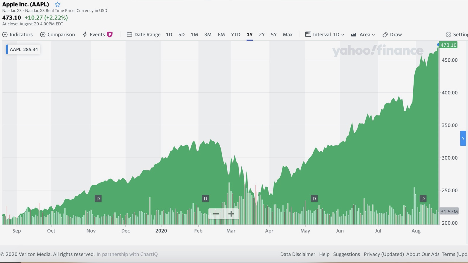 Hodnota akcií stúpla od začiatku tohto roka o 60 %. Dôvodom môže byť dôvera investorov v technológie, ale aj neistota počas koronakrízy a vyšší objem peňazí na finančnom trhu v dôsledku finančnej politiky centrálnej banky USA.
