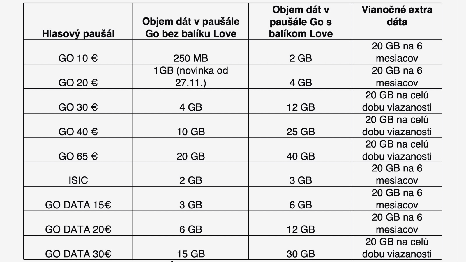 V rámci balíka Love obsahuje paušál Go 30 € extra 8 GB mesačne, čo je spolu 12 GB (4 GB štandard + 8 GB extra). Aktuálnou novinkou je, že za vytvorenie Love väzby dostane zákazník k týmto dátam ďalších 10 GB mesačne počas celej doby viazanosti. Dokopy tak bude mať zákazník v rámci svojho paušálu Go 30 € k dispozícii až 32 GB, z čoho je 28 GB dát mesačne vianočný bonus.