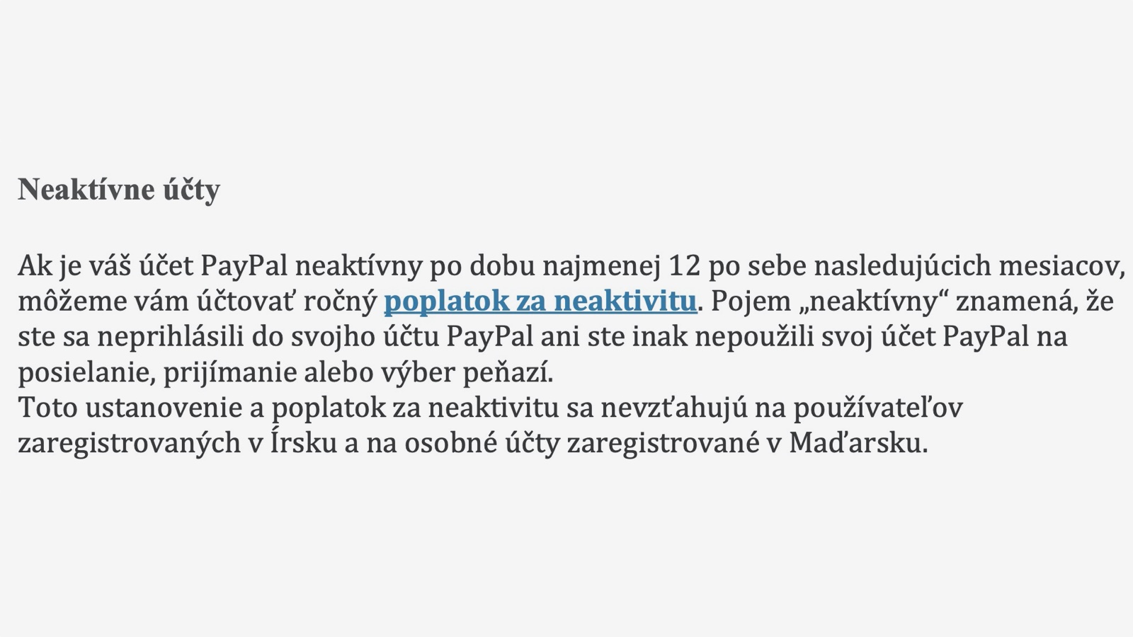 V podmienkach pribudla položka Neaktívny účet PayPal s poplatkom 12 eur. Poplatok za neaktivitu sa bude účtovať podľa toho, ktorá z nasledujúcich hodnôt je nižšia: či poplatok 12 eur alebo zostávajúci zostatok na vašom účte.