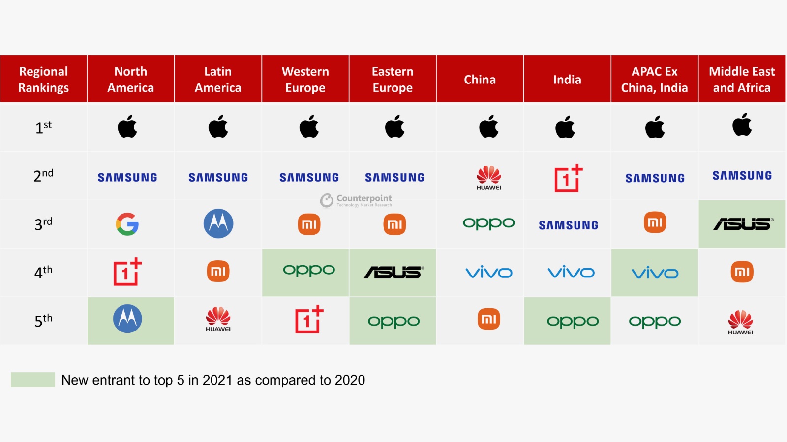 Tretie, štvrté a piate priečky sú na rôznych trhoch obsadené rôznymi značkami smartfónov. V Európe je záujem o Xiaomi, v Severnej Amerike patrí tretie miesto v dodávkach prémiových smartfónov Pixelom od Googlu. V pevninskej Číne nie je o zariadenia Samsung veľký záujem, nedostali sa tam ani do prvej päťky. Zato sa tam darí Oppo, Vivo a Xiaomi.