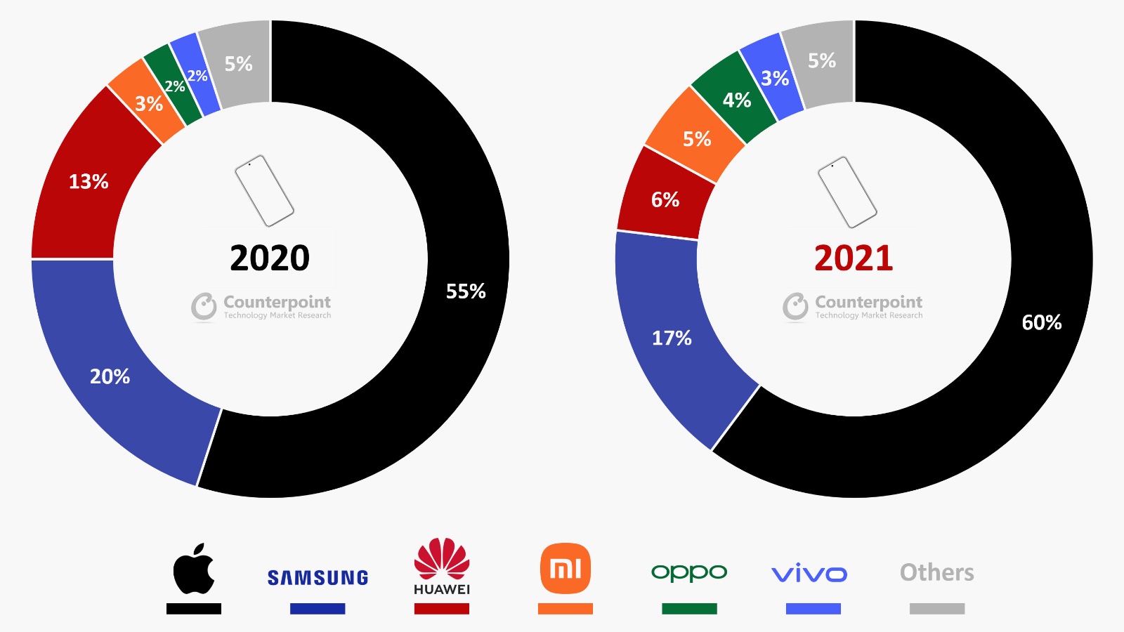 Trh s prémiovými smartfónmi medziročne vzrátol o 7 %, pričom z celkového počtu dodaných smartfónov všetkých cenových kategórií tvorili 27 %. Applu patrí 60 % podiel a stále je vysoký záujem aj o Samsungy. Kórejský výrobca je dlhodobo svetovou dvojkou. Až na čínsky a indický trh, tam Samsung predbehli značky Huawei (Čína) a OnePlus (India).