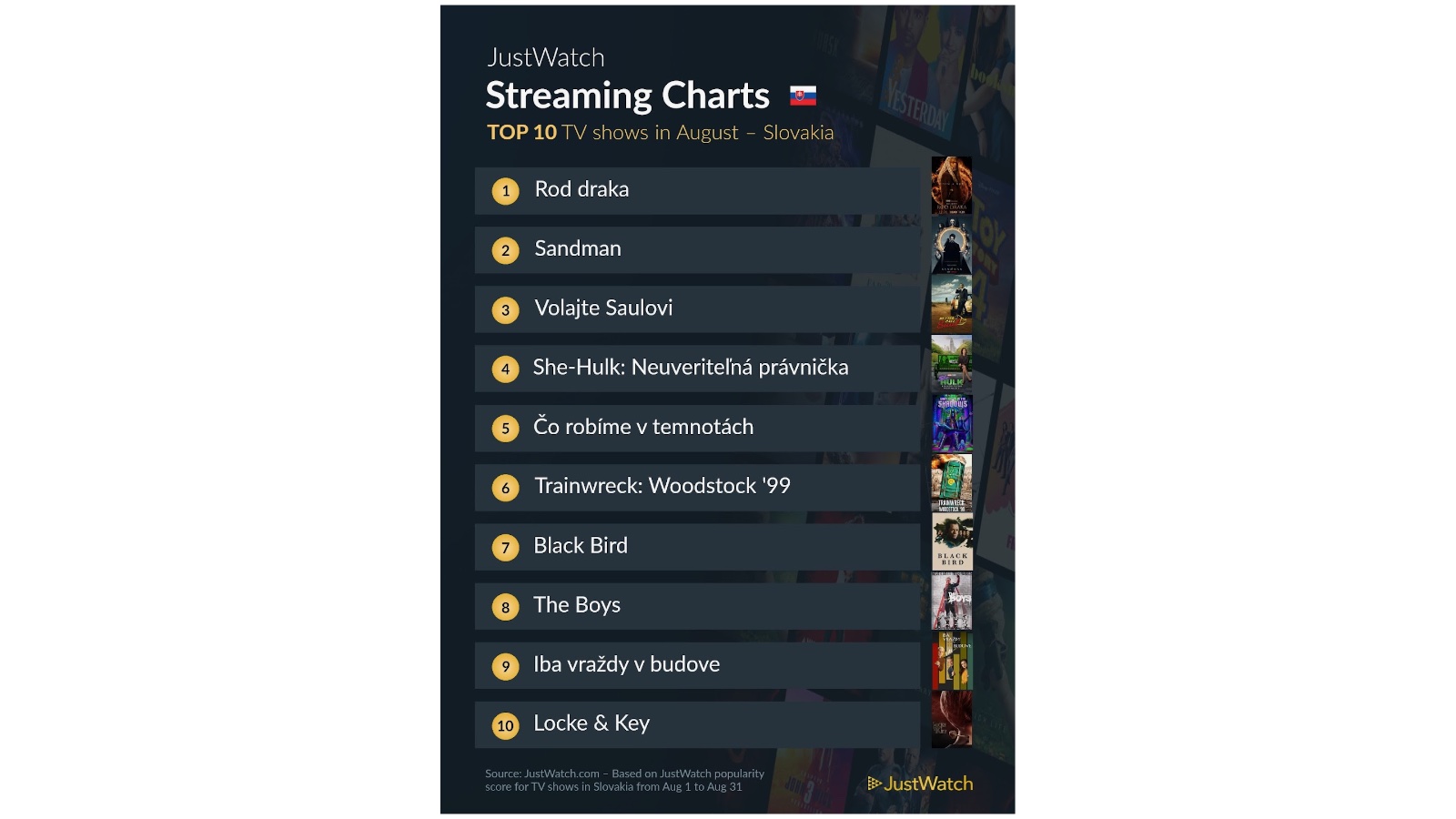 V TOP10 seriálov bol v auguste jednotkou podľa webu JustWatch očakávaný seriál Rod draka, ktorý zaujme najmä fanúšikov úspešnej ságy Hra o tróny.