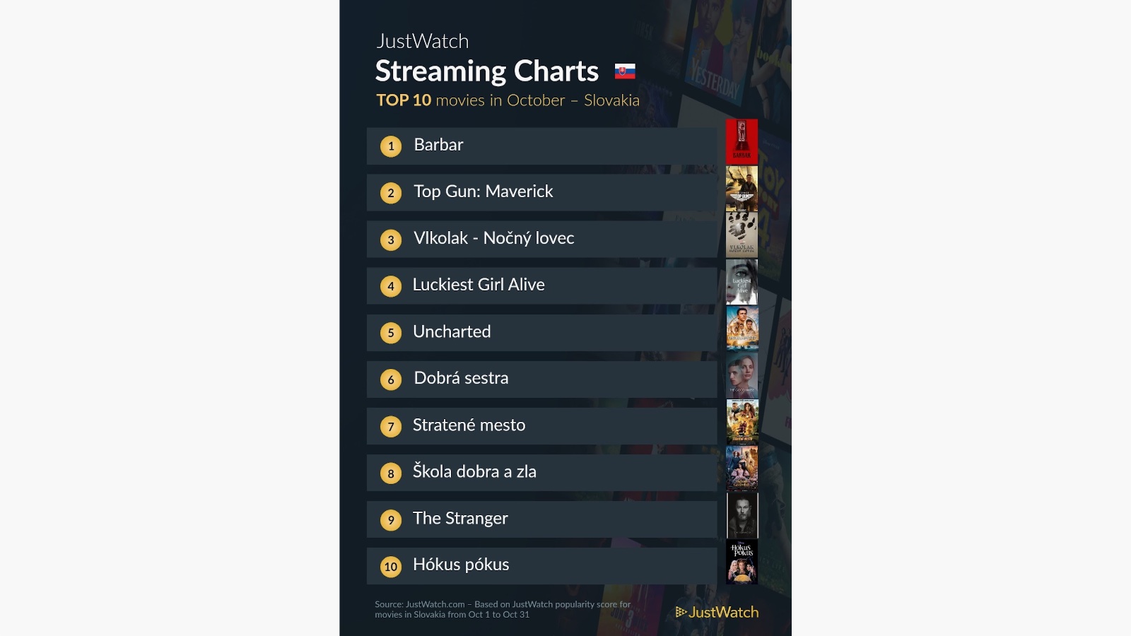 Jednotkou v kategórii filmov bola v októbri snímka Barbar. Kto má rád napätie a nečakané rozuzlenia, nemal by si nechať ujsť príbeh mladej ženy, ktorá v prenajatom dome nájde nečakaného hosťa. Minulomesačný víťaz Top Gun: Maverick s Tomom Cruisom v hlavnej úlohe, sa udržal v top päťke a patrí mu druhá priečka.