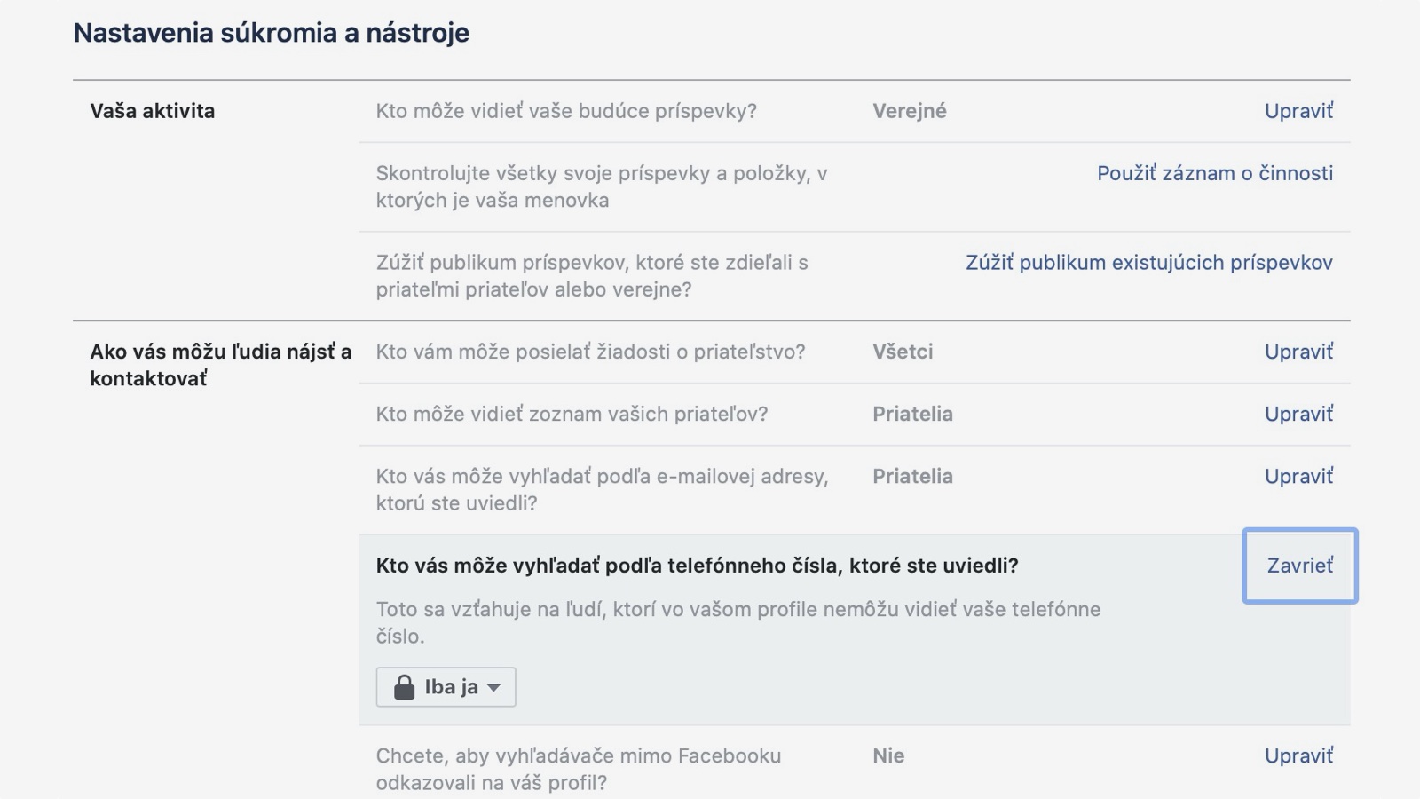 Aby ste v budúcnosti znížili riziko ukradnutia vašich údajov, skontrolujte si, aké má váš profil zabezpečenie súkromia. Kto môže vidieť vaše telefónne číslo alebo e-mailovú adresu.