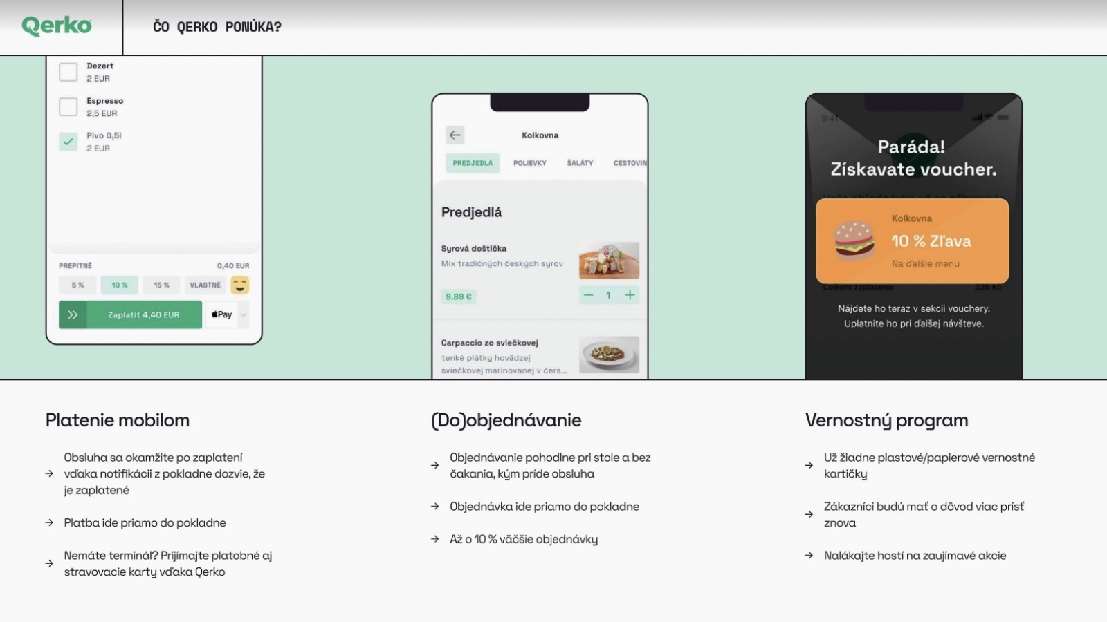Princíp je jednoduchý. V reštaurácii s Qerkom si môžete prostredníctvom rovnomennej aplikácie cez QR kód umiestnený na stole priebežne kontrolovať zoznam konzumovaných jedál a nápojov a kedykoľvek svojím mobilom zaplatiť tie položky, ktoré si označíte. Pridať môžete aj prepitné.