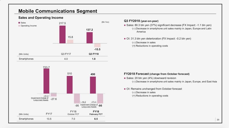 Takmer všetkým divíziám spoločnosti sa darilo. Jedinou, ktorá vykázala stratu, je mobilná divízia. Napriek reštrukturalizácii, zníženiu nákladov a iným opatreniam sa divízia dostala do straty 15,5 miliardy JPY (123,2 mil. EUR). Dôvodom sú medziročne výrazne nižšie tržby, ktoré z 217,5 mld JPY klesli na 137,2 miliardy jenov (1,091 mld. EUR).