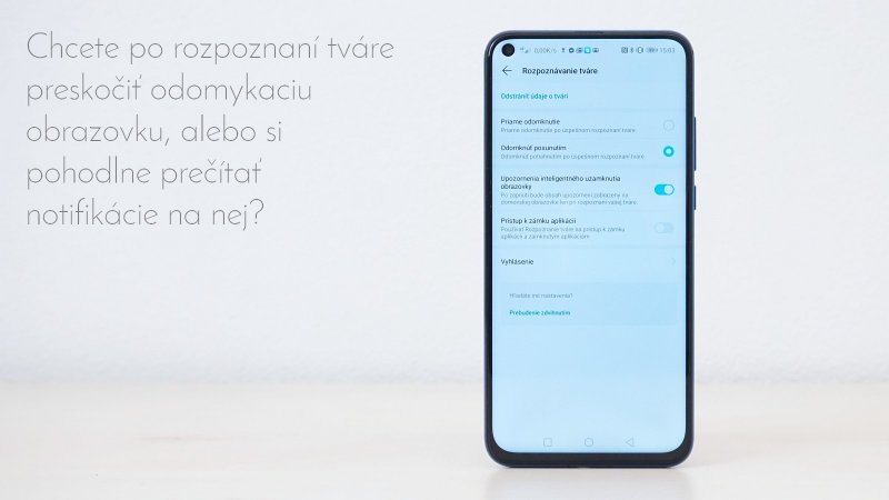 Po rozpoznaní tváre môže mobil odomykaciu obrazovku preskočiť, ale ja som si v nastaveniach rozpoznávania tváre zmenil Priame odomknutie na Odomknutie posunutím. Po zodvihnutí mobilu sa tak displej rozsvieti, ja si pozriem upozornenia, prípadne odspodu vyrolujem lištu s rýchlym skokom na kalkulačku alebo svietidlo.