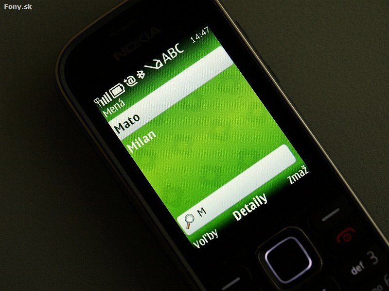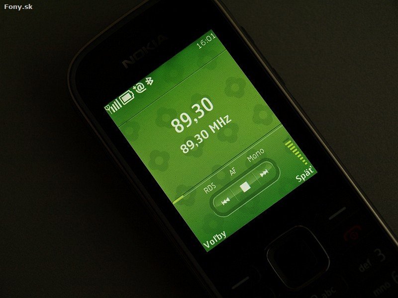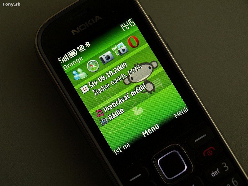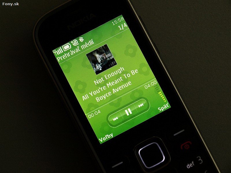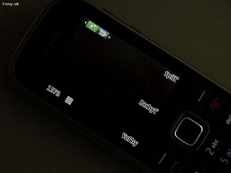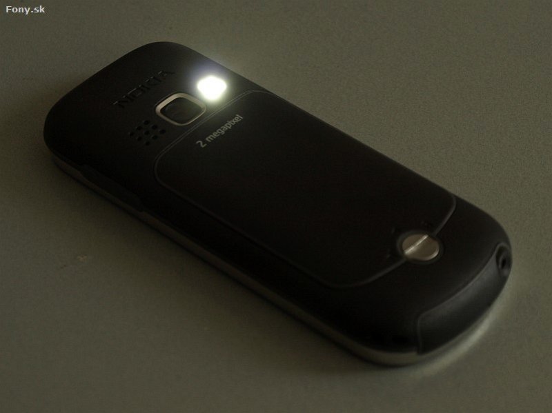 sa rozprestiera na 2,2-palcovej uhlopriečke. Jeho vlastnosti sú staré známe. Viditeľnosť displeja na slnku je pomerne dobrá, existujú aj modely, ktoré sú na tom oveľa horšie. Užívateľské prostredie Series 40 svojimi možnosťami nijako neprekvapuje, no ani nesklame. Domáca obrazovka je tvorená aktívnym pohotovostným režimom. Ten je prepojený s aplikáciami ako kalendár, prehrávač medií či rádio. Lištu skratiek si môžete ľubovoľne naprogramovať. Vzhľad menu je štandardne tvorený maticou ikon v rozložení 3 x 3. Nastavenia umožňujú vybrať si z viacerých druhov zobrazenia (zoznam, ikony, ikony s menovkami, záložky). Poradie položiek menu si môžete meniť. Nastavenia displeja sa týkajú skôr personalizácie domácej obrazovky, okrem iného umožňujú meniť tapetu, šetrič displeja, veľkosť písma, aktivovať šetrič energie či zobrazovanie ikon skratiek smerového tlačidla. aj pri zvolenej najvyššej kvalite svojimi výsledkami skôr sklame. Fotografie sú aj pri dobrých svetelných podmienkach zašumené a vhodné akurát na prezeranie v mobile. Jedinou pozitívnou zmenou oproti štandardu je prítomný LED blesk, ktorý v tmavých priestoroch čo-to pomôže. Fotografovanie prebieha na výšku s možnosťou aktivovania režimu na šírku. Nastavenia umožnia vybrať si jeden z piatich efektov, aktivovať samospúšť, meniť vyváženie bielej či kvalitu a veľkosť snímky. Zvuk kamery a fotoaparátu sa dá vypnúť. Video používa rozlíšenie 176 x 144 bodov a jeho kvalita je podpriemerná. Blesk počas nahrávania nemôžete použiť. Ostatné nastavenia umožňujú identickú personalizáciu ako pri fotoaparáte. Prezeranie obrázkov a videí funguje v galérií štandardne na celú obrazovku, no v režime na výšku. Pre režim sledovania fotografií a videí na šírku displeja je nutné stlačiť hviezdičku. Vaše obrázky a fotografie môžete aj približovať.UKÁŽKA VIDEA (súbor 112 kB, 3GPP; obraz: 176 x 144 b., 8 fps, 89 kbps; zvuk: AMR, 12 kbps; celkovo: 0,8 MB / min.)